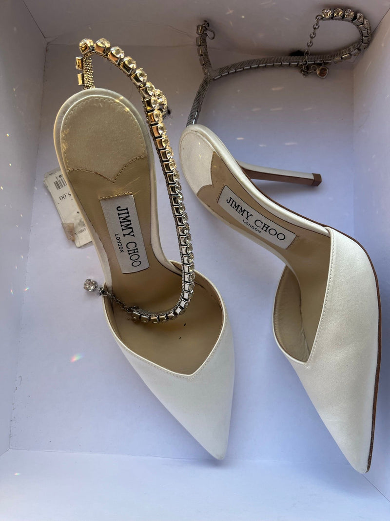 1 IVORY JIMMY CHOO SATIN PUMPS WITH CRYSTAL EMBELLISHMENT