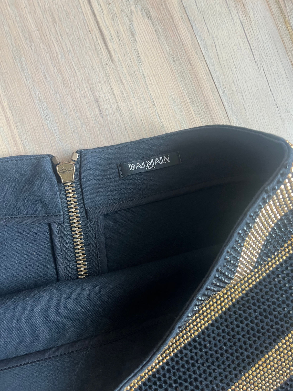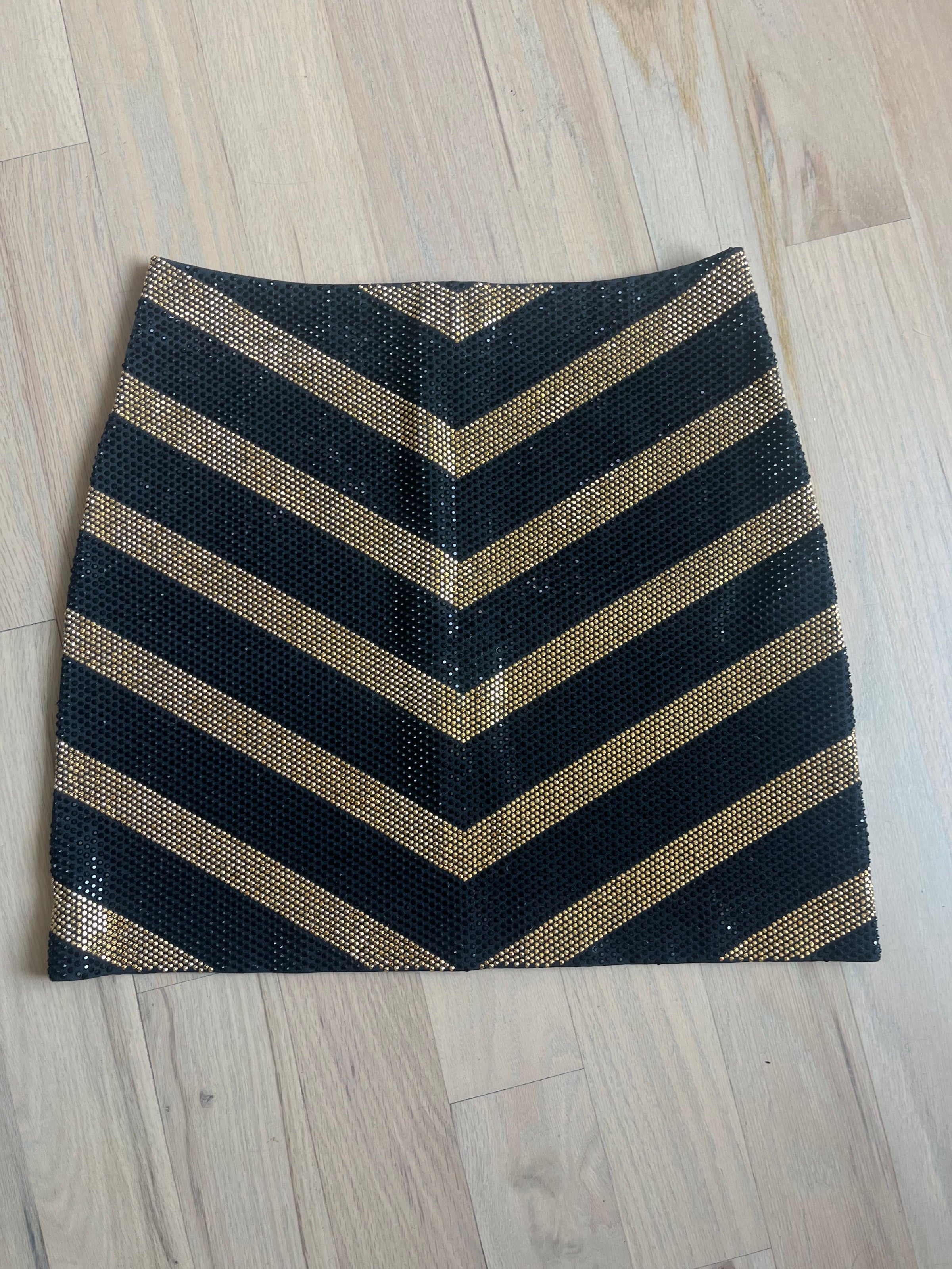Turn heads in this stunning Balmain Beaded Chevron Mini Skirt, a signature statement piece that perfectly blends glamour and edge. Crafted with meticulous attention to detail, this skirt features bold black and gold chevron beadwork that catches the light beautifully from every angle.