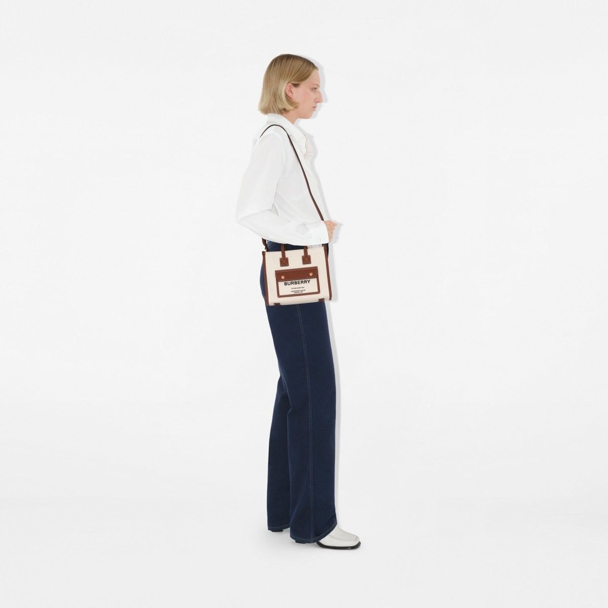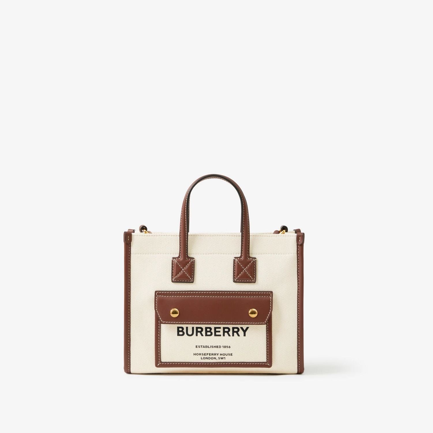 Crafted in Italy, the Burberry Mini Freya Tote is a refined blend of heritage and modern craftsmanship. Made from cotton canvas with topstitched leather trims, this compact piece is inspired by an archival design. It features the iconic Horseferry print on the magnetic front pocket and includes both top handles and an adjustable leather strap for versatile wear.