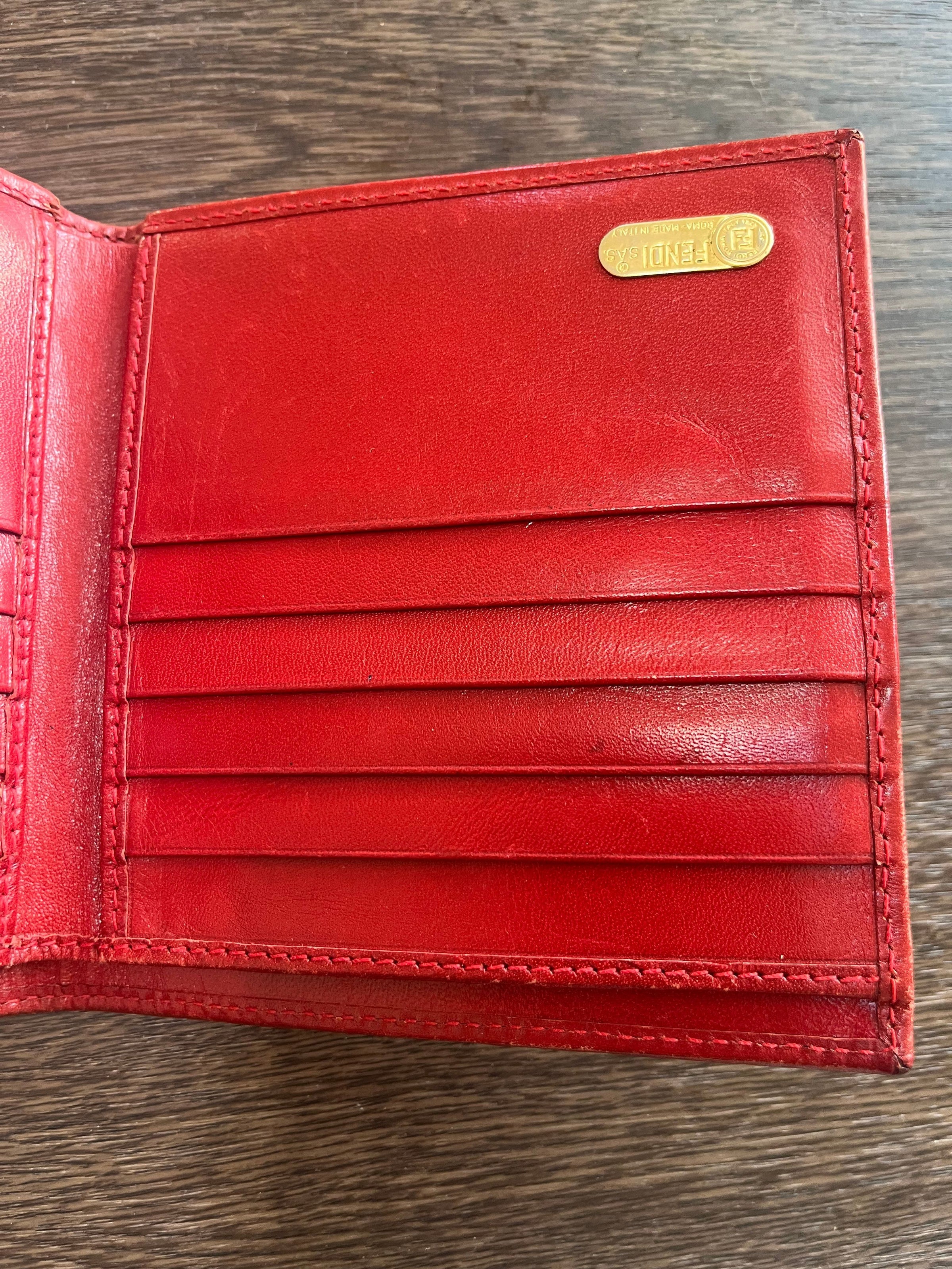 Bold and stylish, this Fendi wallet features a vibrant red animal print for a statement accessory. Compact yet functional, it’s perfect for carrying essentials in style.