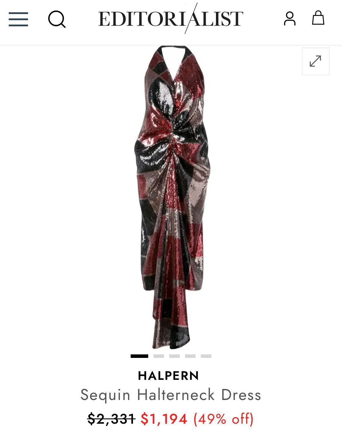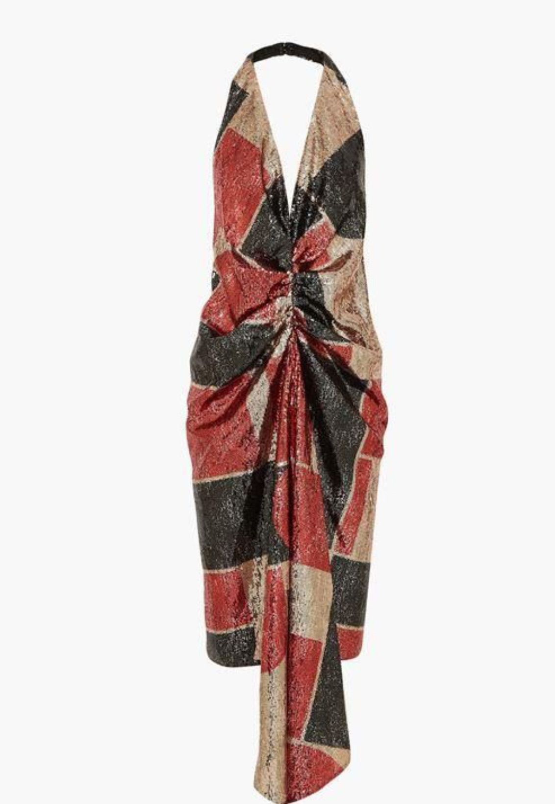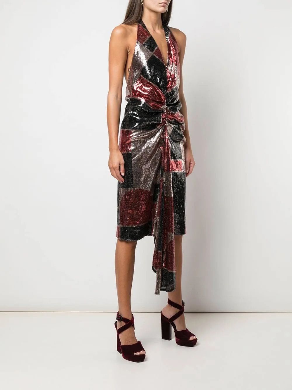 Halpern Sequin Midi Dress – Multicolour – Bold, glamorous, and unapologetically eye-catching, this Halpern Sequin Midi Dress is a true statement piece. Adorned with multicoloured sequins in a striking color-blocked design, it features a halterneck with a plunging V-neckline, ruched detailing, and an elegant open back. The draped silhouette adds fluid movement, making it perfect for evening events, galas, or parties.