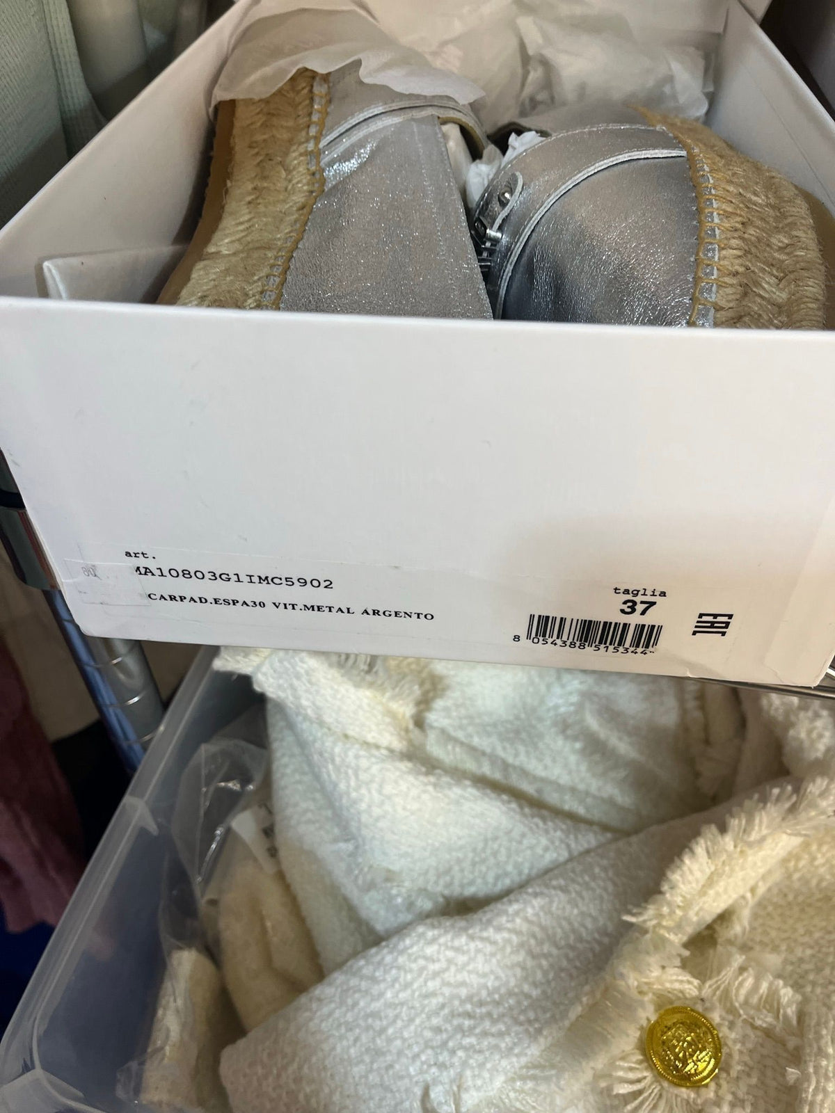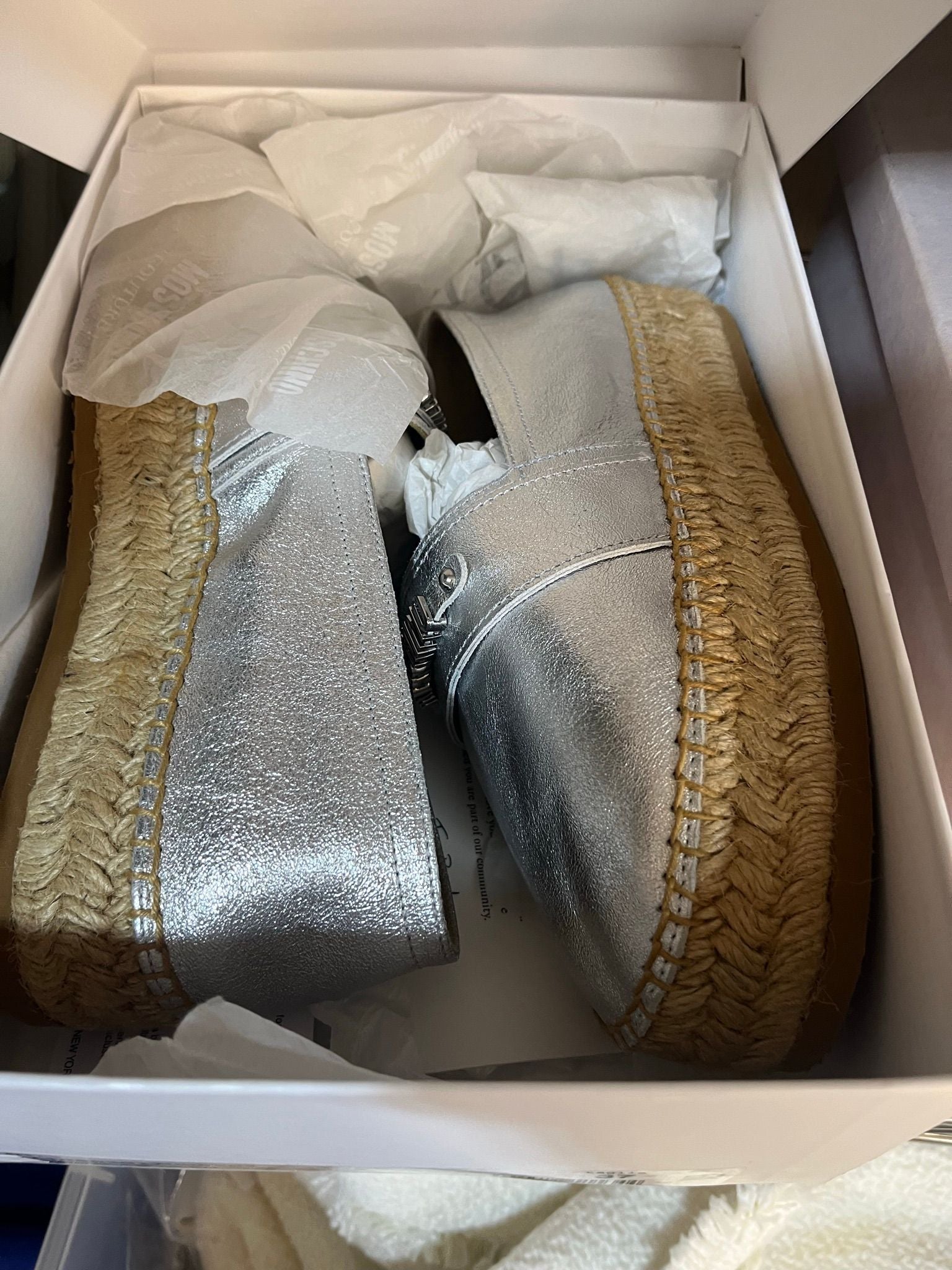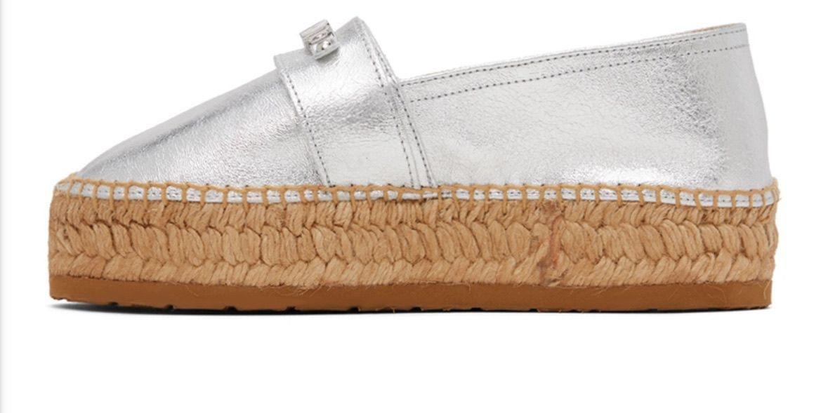 MOSCHINO SILVER MINI LETTERING LAMINATED ESPADRILLES