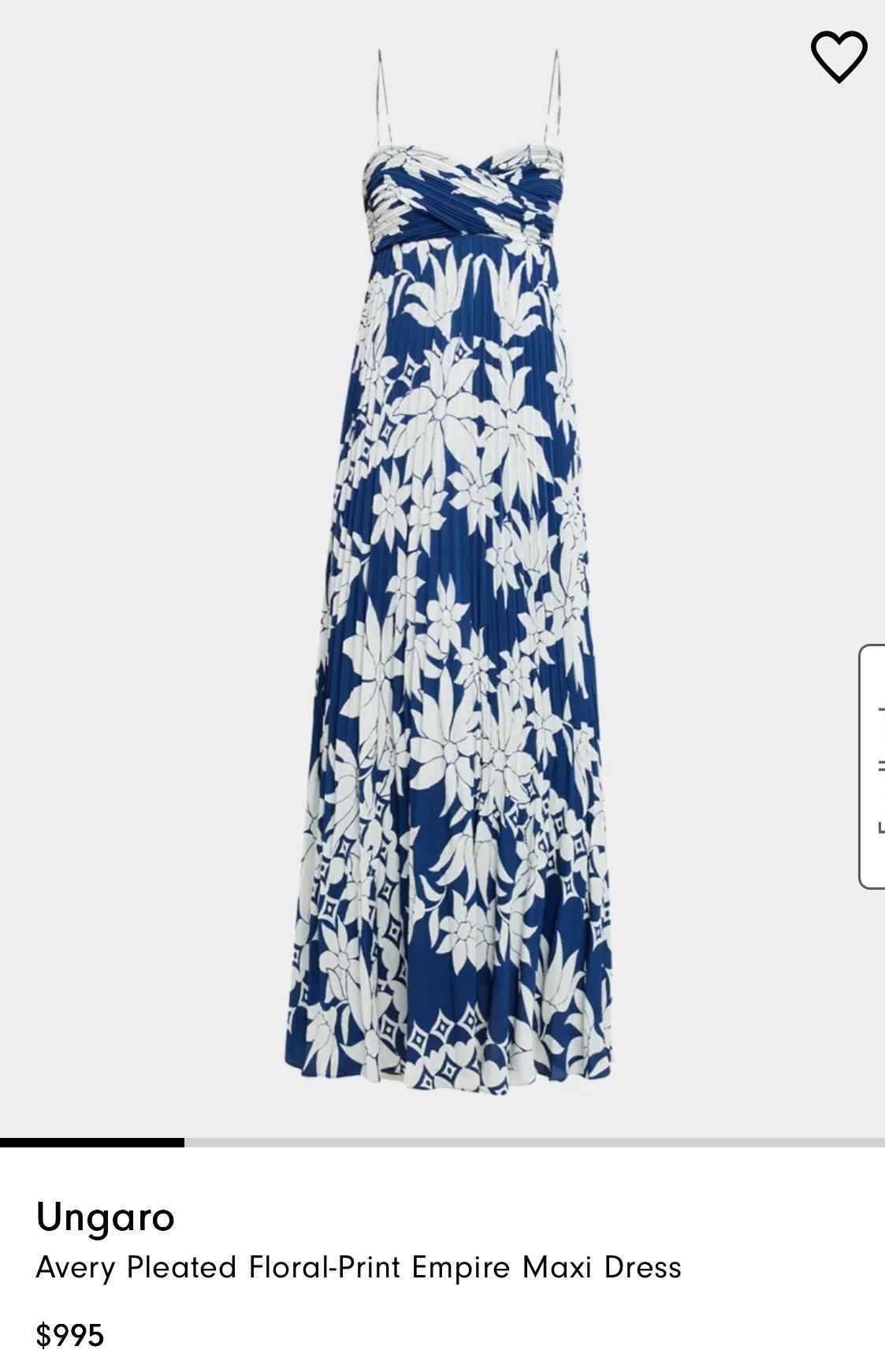 This elegant pleated maxi dress from Ungaro features a fitted bodice with delicate straps and a flowing pleated skirt that adds graceful movement. The design highlights timeless femininity with a flattering 17” PTP fit, perfect for formal occasions or evening events.